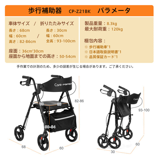 Care-Parents 歩行器 四輪 歩行車 シルバーカー アルミ製 折り畳み式 手押し車 高齢者 簡単組立 高さ調節可 1台3役 室内室外兼用 (CP-Z21BK)